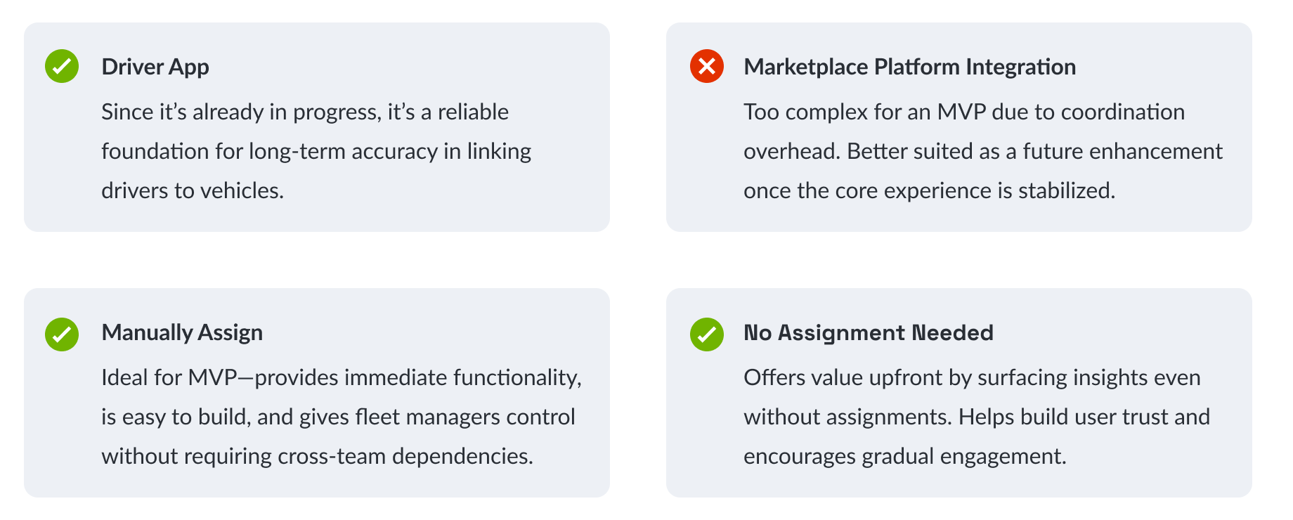 We were initially focused on the ideal scenario — since a team in Europe was building a Driver App in parallel, it seemed easy to capture this information automatically through the app. However, the Driver App is a paid service, and not all users will enroll right away. We needed to provide alternative ways to link drivers and vehicles from day one.